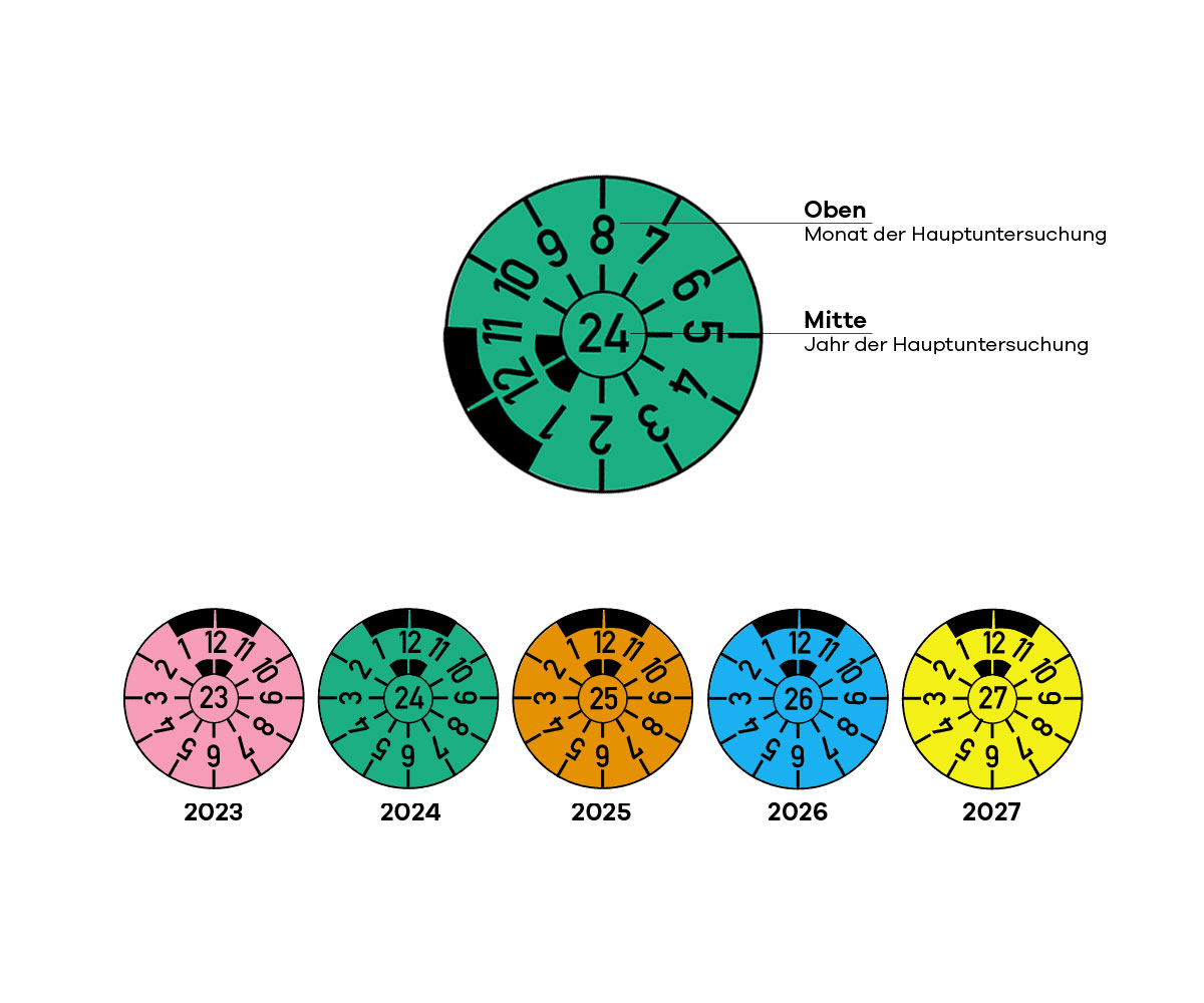 HU-Plakette am hinteren Fahrzeugkennzeichen: Im Mittelpunkt der HU-Plakette finden Sie das Jahr der Fälligkeit. Die Zahl im äußeren Ring, die nach oben zeigt, zeigt den Monat an, in dem die HU fällig ist. Um auf einen Blick feststellen zu können, ob die Hauptuntersuchung bereits erfolgt ist, ändert sich die Farbe der Plakette von Jahr zu Jahr. Zusätzlich sind schwarze Markierungen auf der Plakette angebracht, um den Monat der TÜV-Fälligkeit aus der Ferne erkennen zu können.